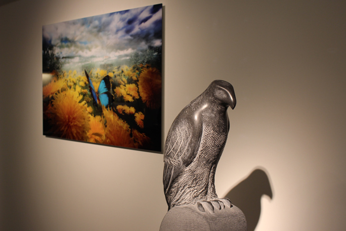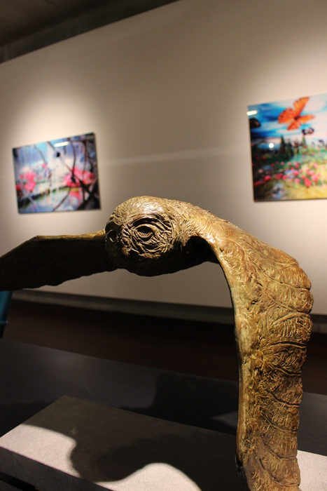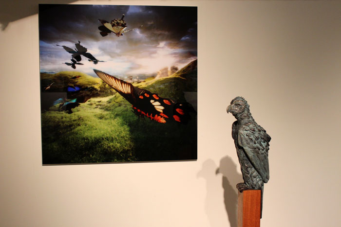 De Apenarend die Fiona heeft gemaakt zit zelfverzekerd op zijn plek. De klauwen stevig en resoluut om de stam geklemd, de rug gestrekt en de arrogante blik op oneindig. De vogel maakt zich blijkbaar geen zorgen of hij deze dag wel wat te eten krijgt. Fiona heeft goed gekeken naar het karakter en de expressie van het beest zelf. De kraag is proportioneel uitgevoerd, evenals ‘de stola’ van veren op zijn schouders. De krachtige snavel nodigt uit om te voelen of de punt echt zo scherp is als het lijkt. Het groene patina is mooi verdeeld over het lichaam. Daar waar de groeven en inkepingen zijn is het kopergroen aanwezig, naar buiten toe lijkt het of de natuur haar werk heeft gedaan en wordt het brons –aaibaar- donkerder. Het verenpak ziet er bijna abstract uit, maar is toch heel natuurgetrouw.