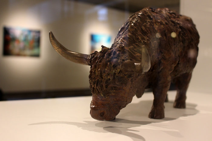 Zo is met een goede smaak de vacht van de Schotse Hooglander weergegeven. Wat we niet direct zien is dat dit beeldhouw-technisch lastig is. Fiona weet echter op een geavanceerde manier de huid zo te bewerken dat de wollige textuur van het beest welhaast tastbaar wordt. De textuur en het patina maken subtiel gebruik van de inval en de eigenschappen van het licht.