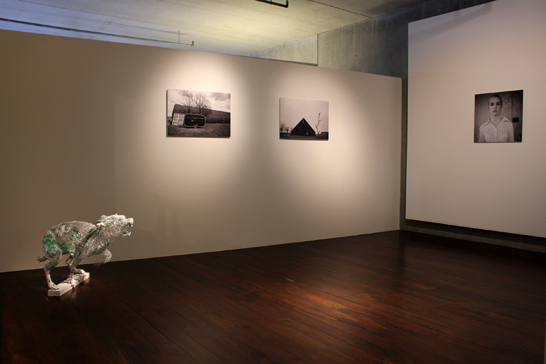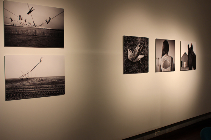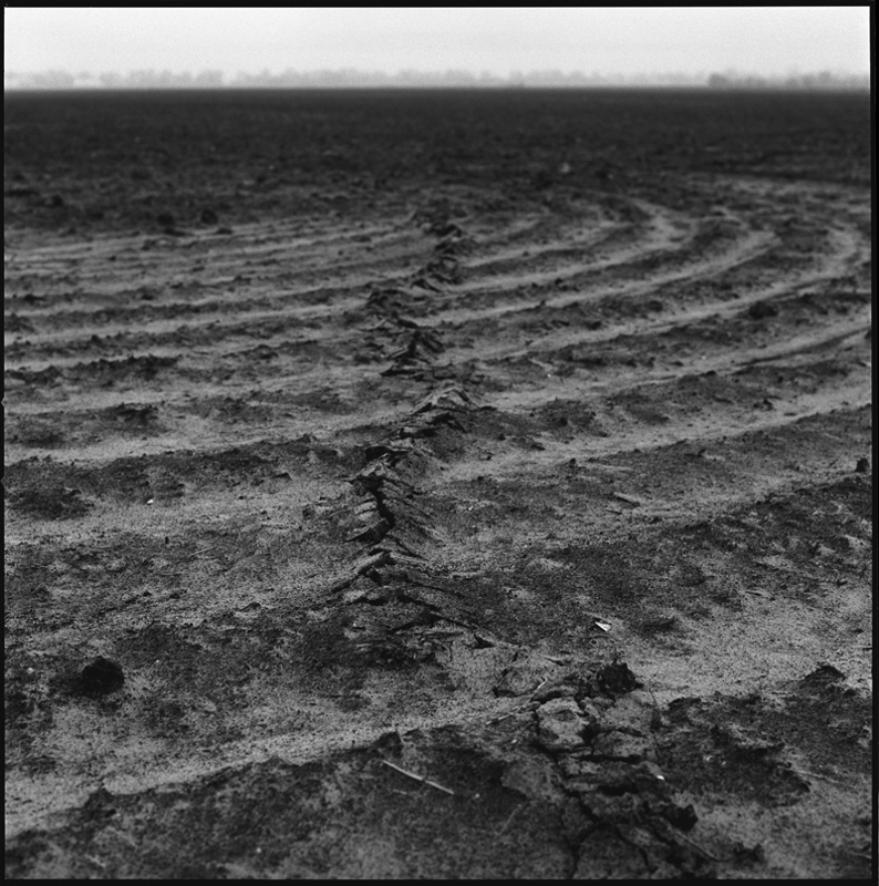 Door zijn tochten vooral in het vroege voorjaar en late najaar te maken vergroot de fotograaf het contrast. De takken zonder bladeren verworden tot grafische lijnen en de grond is inktzwart. Ook een verlaten bushokje en sproeier fungeren als subtiele krabbels in een desolaat landschap. Hoewel een mens meestal achterwege blijft zijn er in elke foto menselijke sporen aan te wijzen. Al is het maar een stuk doek dat nog half over het bewerkte land ligt. Of waslijnen met ongebruikte knijpers die tot aan de horizon lijken te lopen. Deze laatste foto heeft diffuse zwarte randen waardoor je nog meer wordt meegezogen langs de waslijnen naar het oneindige land, waar een grote stilte heerst.